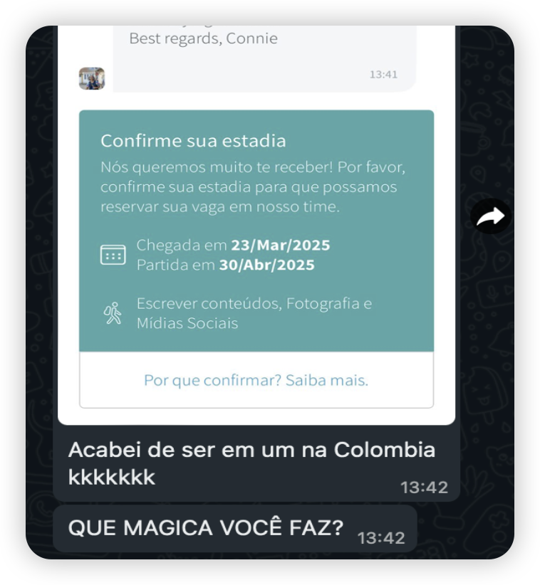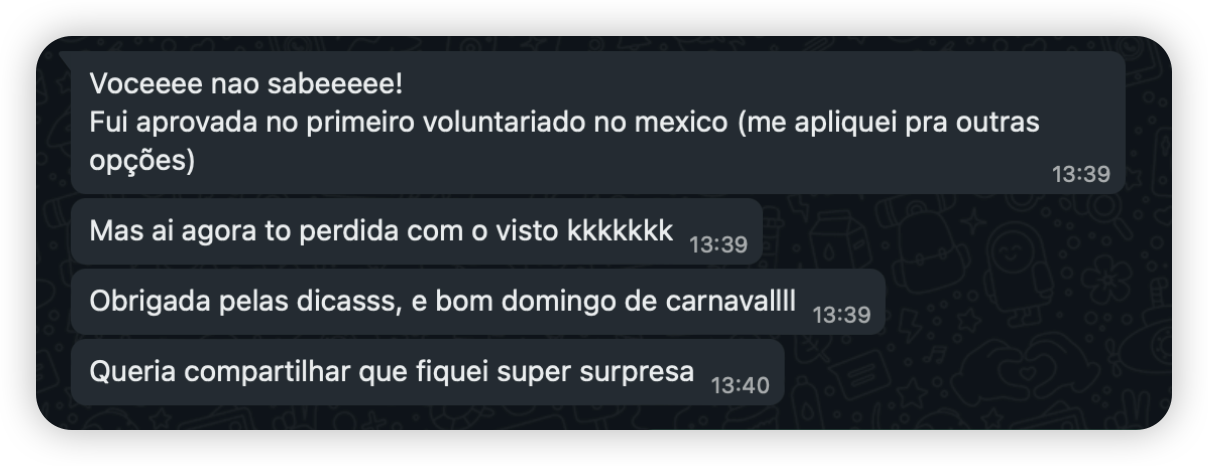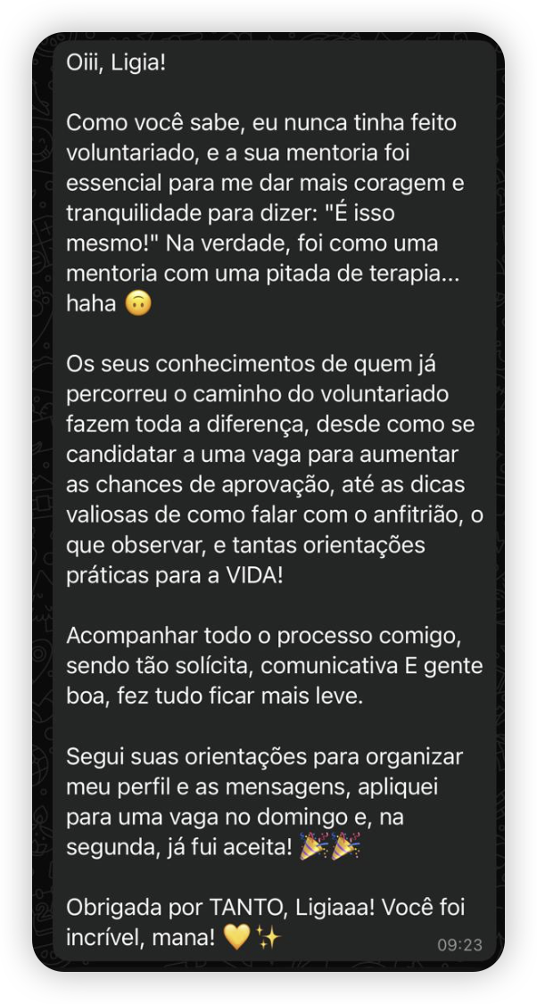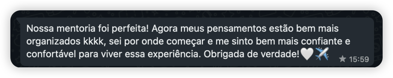 Aaaa gostei muito da nossa primeira mentoria 💗💗, fiquei mais tranquila com a sua mentoria. Aprendi várias coisas que eu não sabia e amei sua simpatia 🥰 estou mais animada e segura para minha primeira viagem sozinha, fiquei com mais direção para realizar meus sonhos.. Obrigada por compartilhar seus conhecimentos e suas dicas 💕💕