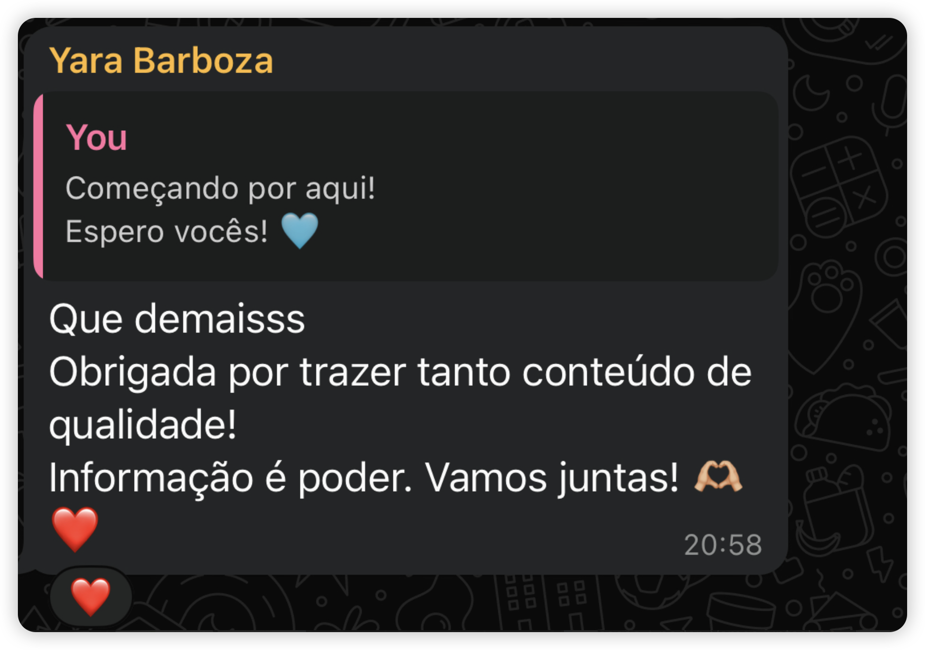 Eu ameeei a mentoria!! É muito bom conversar com quem tem experiência né?! Kkkk foi muito bom para perceber o que eu preciso começar olhando e não acabar colocando a carroça na frente dos bois kkkk as dicas foram maravilhosas também e tô cada vez mais animada pra que tudo se torne realidade de fato!! ❤️✨